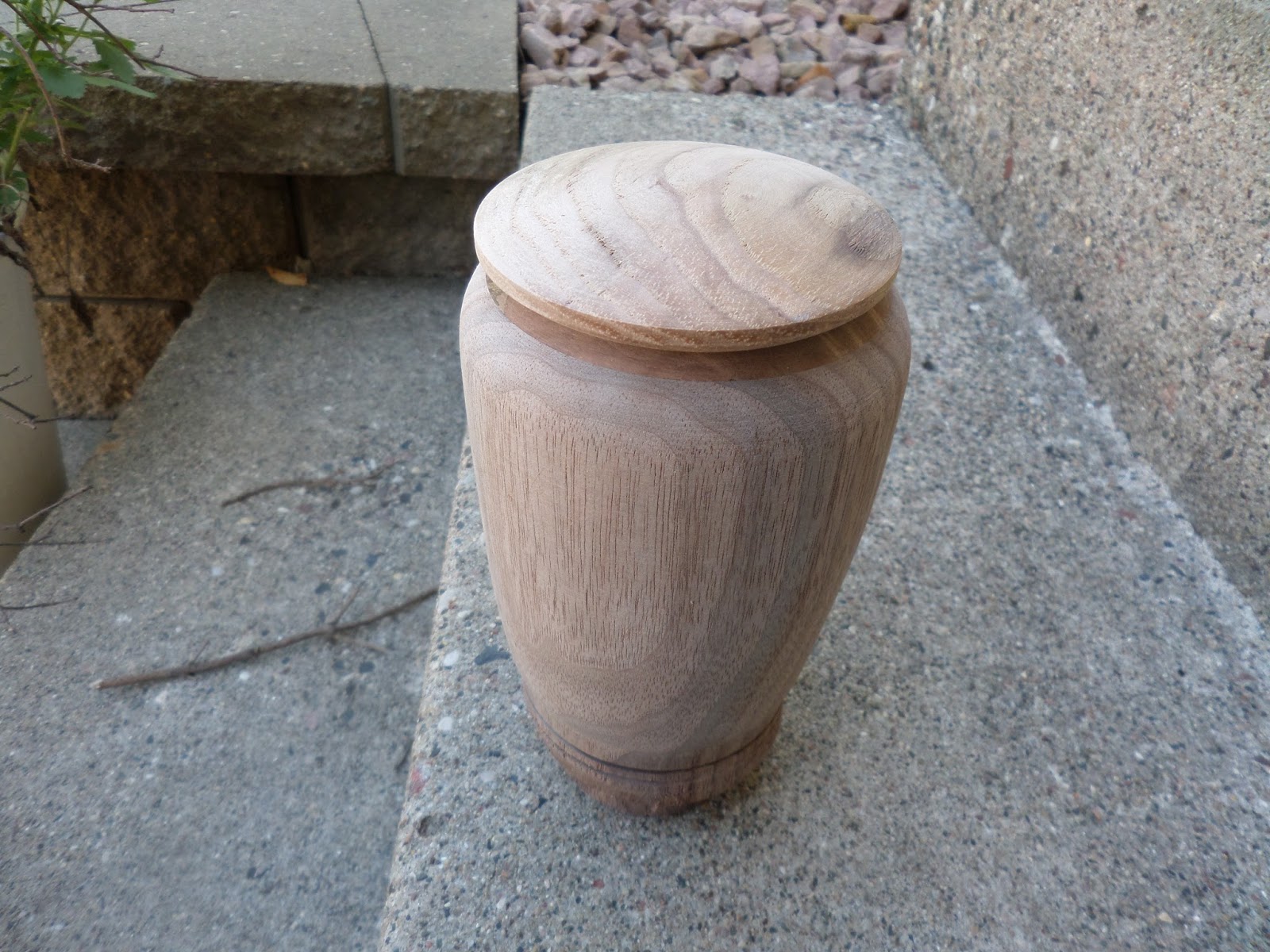I was working on the pet urn for a friend of mine and today I finished turning it, constructing the lid, sanding it smooth, and applying a preliminary finish. Here are the photos: